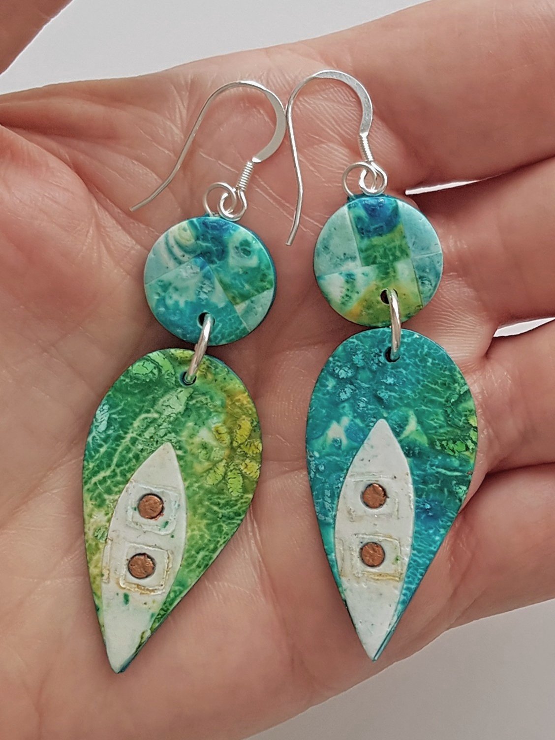 Polymer clay is extremely light and durable, allowing me to create contemporary, statement jewellery which is easy and comfortable to wear. Some of these earrings feature patterns made solely by manipulating the clay; others are the result of mixed media work.